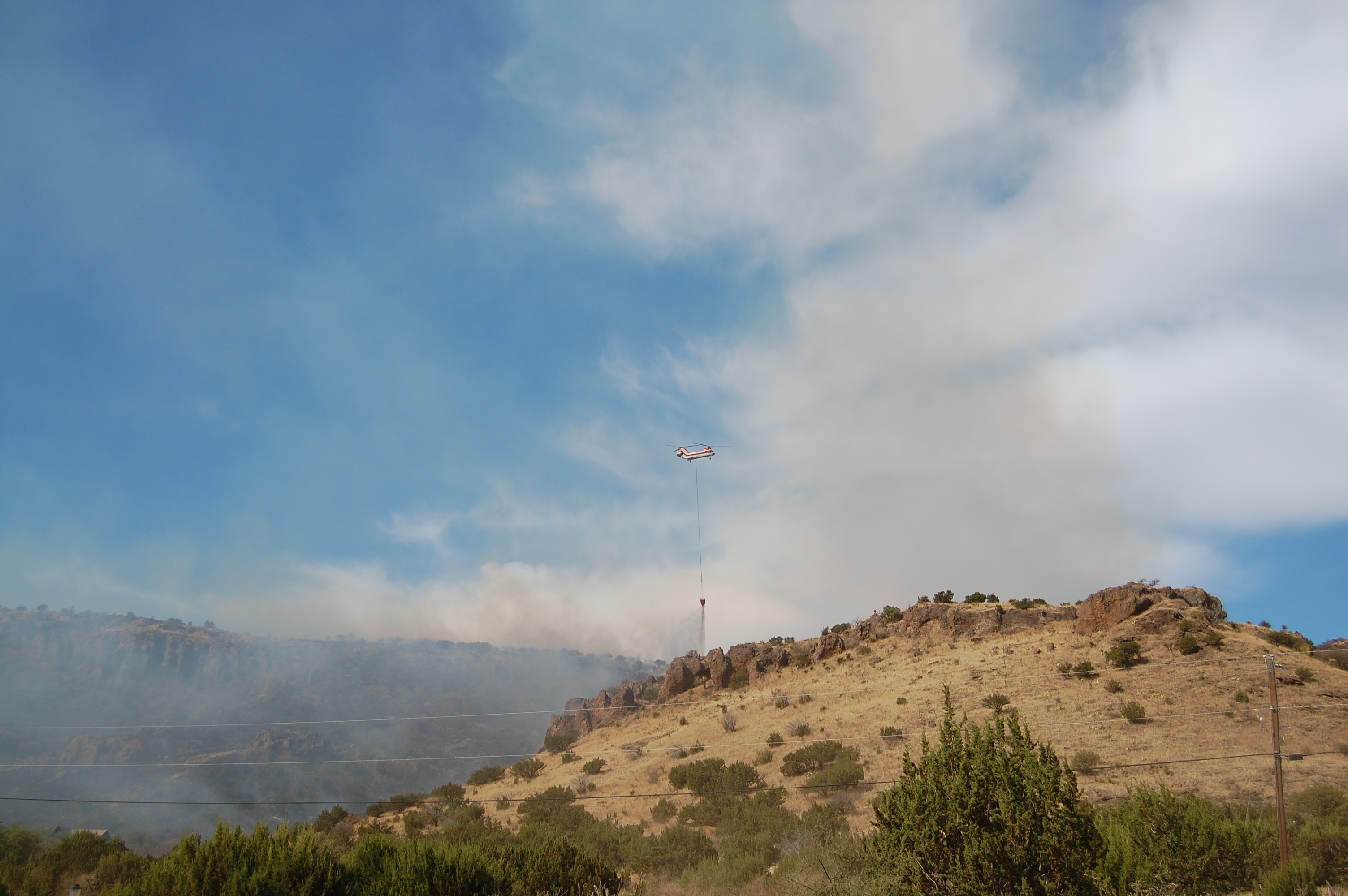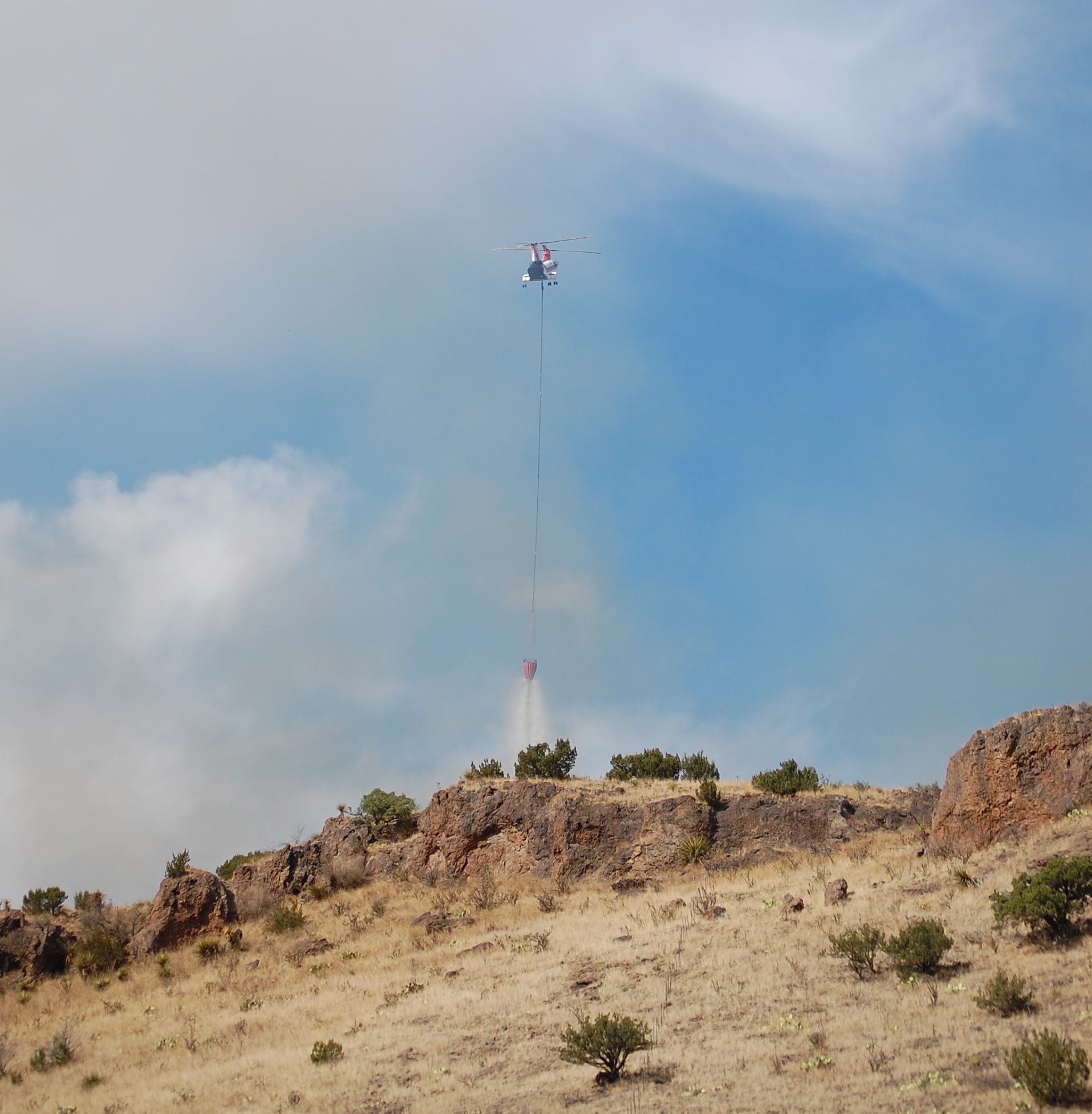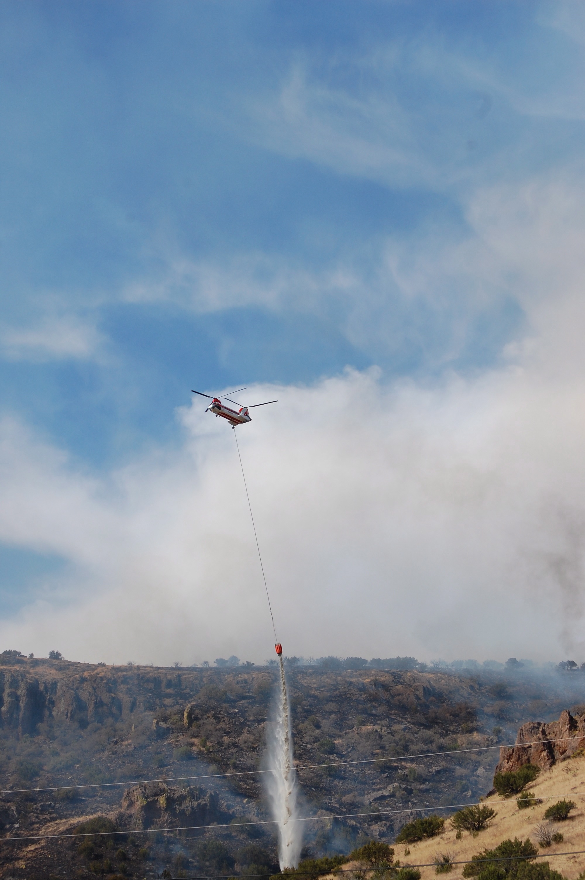 According to Public Information Officer Jerry Rohnert, speaking to Tom Michael on Marfa Public Radio around 10:20 am, the fire was still going, spreading north-northwest. It has burned the ridge above Sunny Glen. Depending on weather, Rohnert reminded listeners, the fire’s behavior and direction could change quickly. There are multiple persons fighting this fire on several flanks, including local ranchers helping via water tanks on trucks. Three “heavy airtankers,” several smaller cropduster-like aircraft, helicopters, and bulldozers creating new fire lines (strips cleared of brush) are all in use.