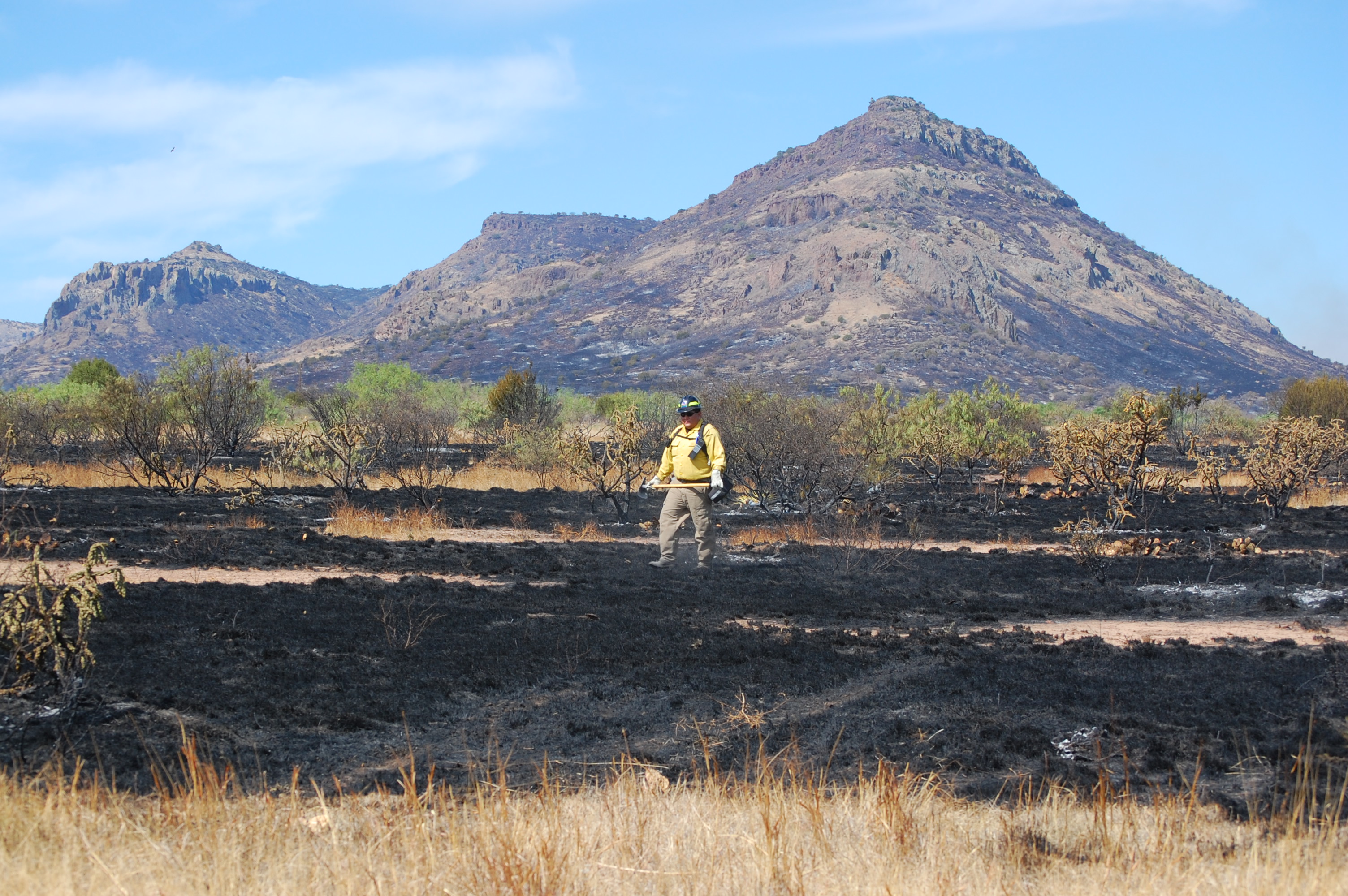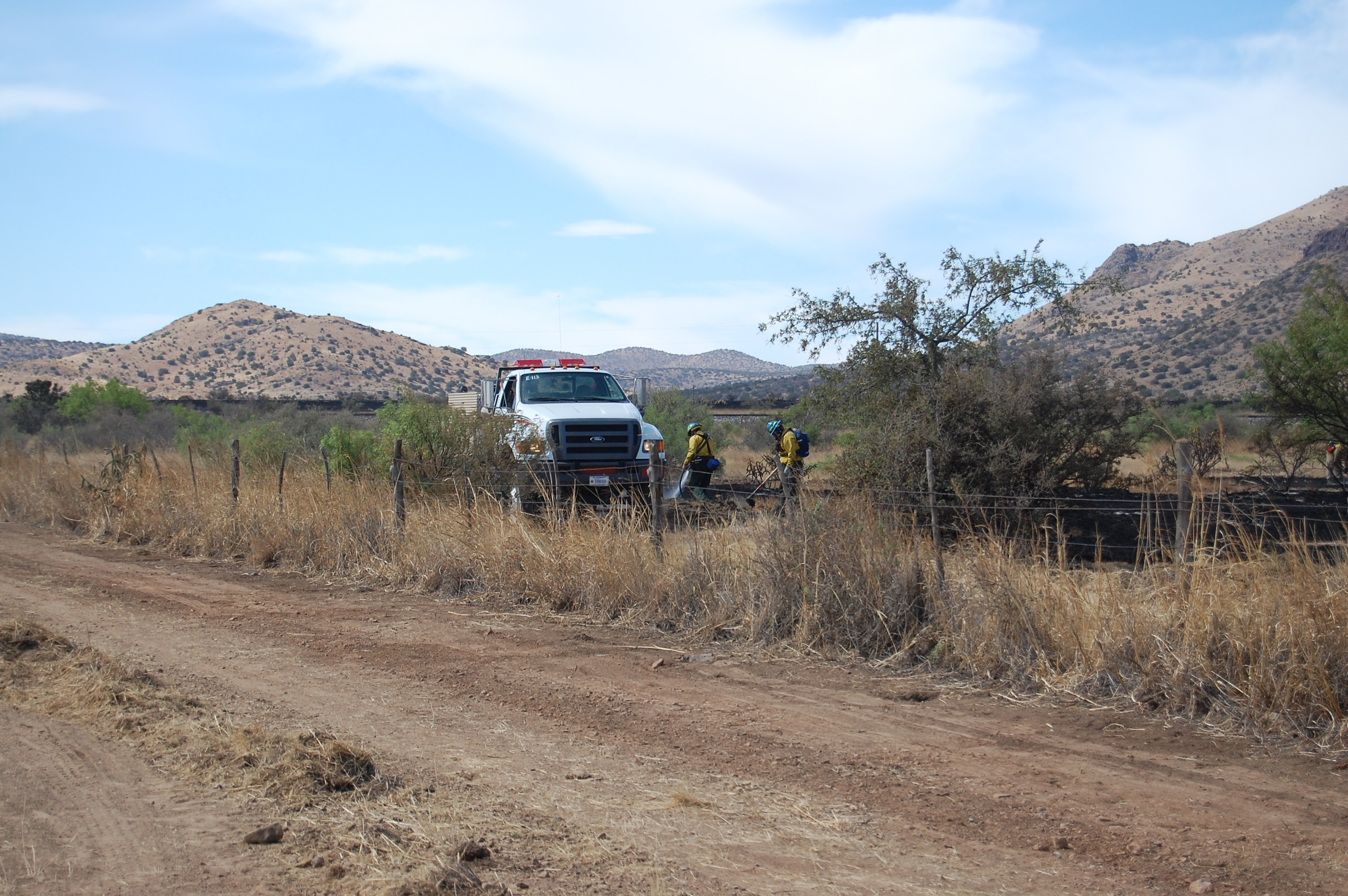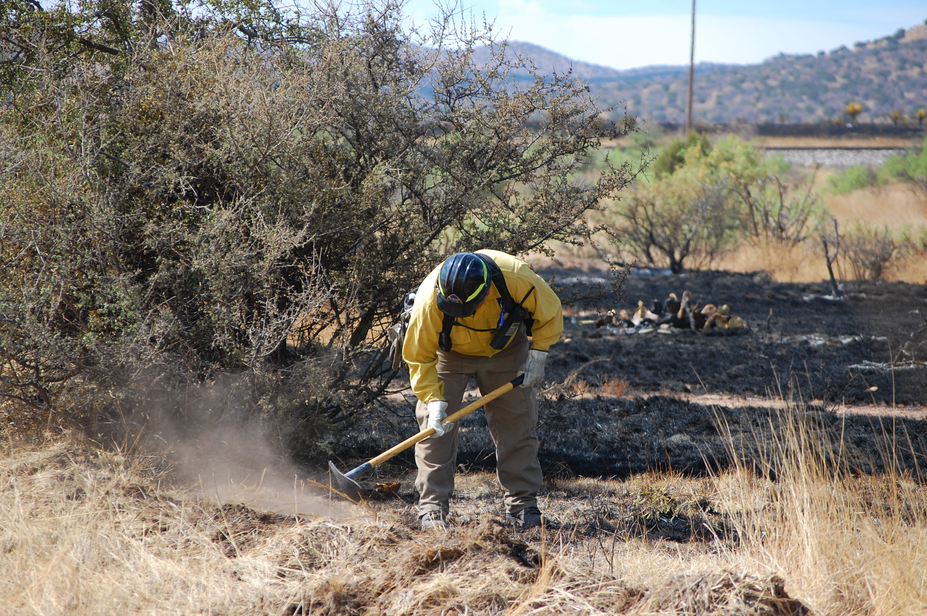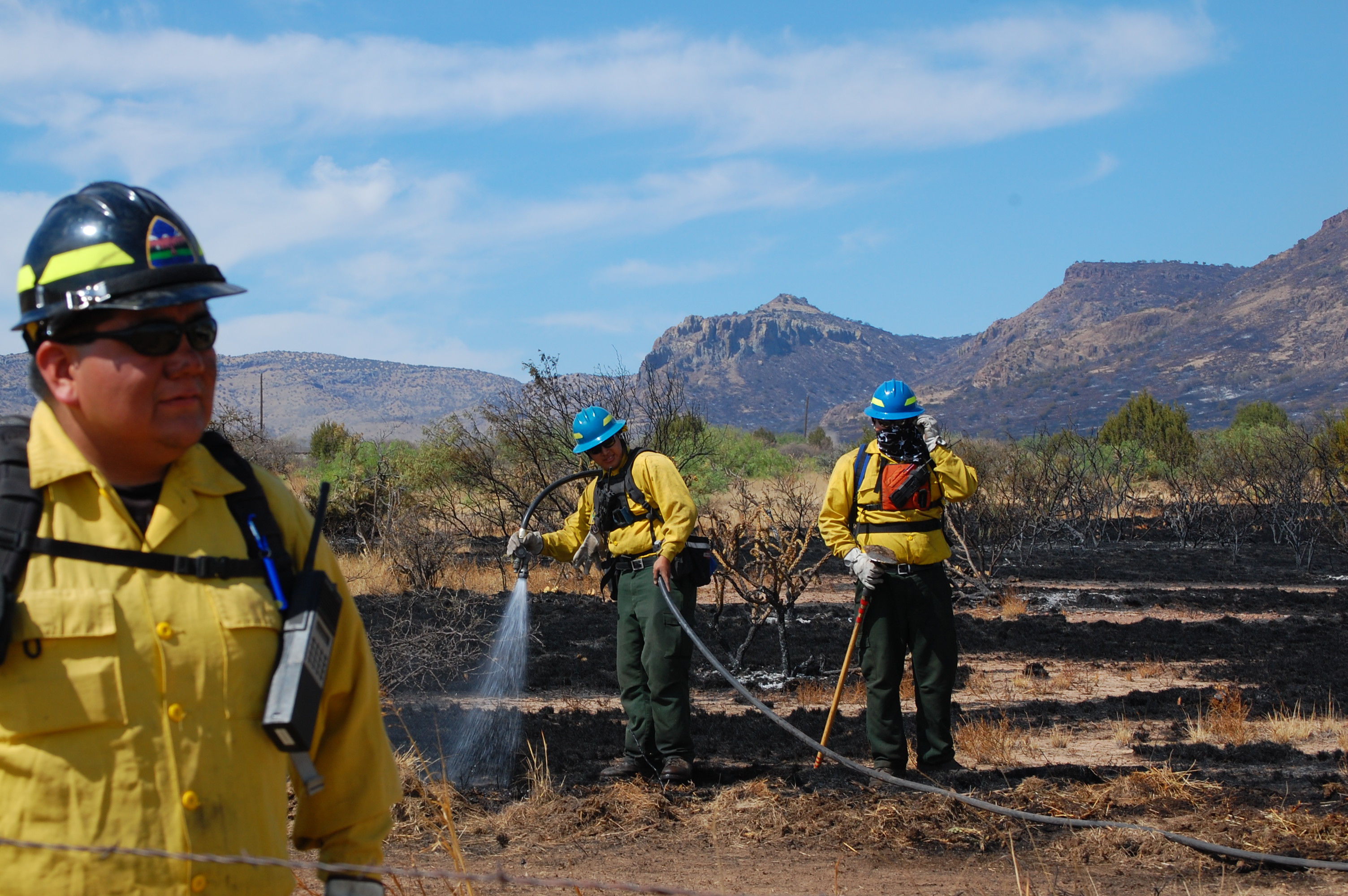 Above: Firefighters working along FM1703 at 11 am are from the U.S. Department of the Interior, Bureau of Indian Affairs. They are based at Fort Duchesne, Utah. According to Chris Secakuku (left) the Northern Ute firefighters were doing mop-op operations and extinguishing hot-spots. Their goal was to “reinforce a line and make sure the fire did not cross the road,” said Secakuku.
