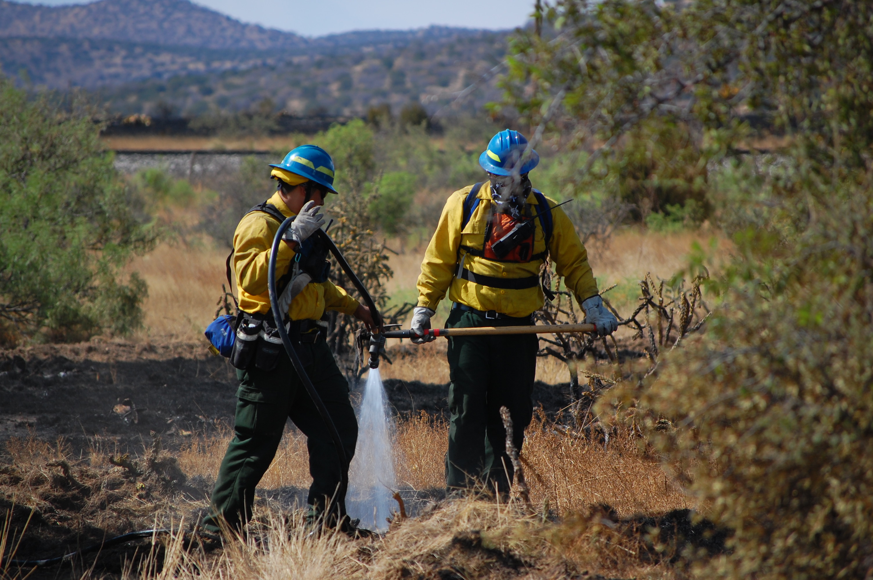 Above: Firefighters watering down a burnt area next to a newly-created fire line.